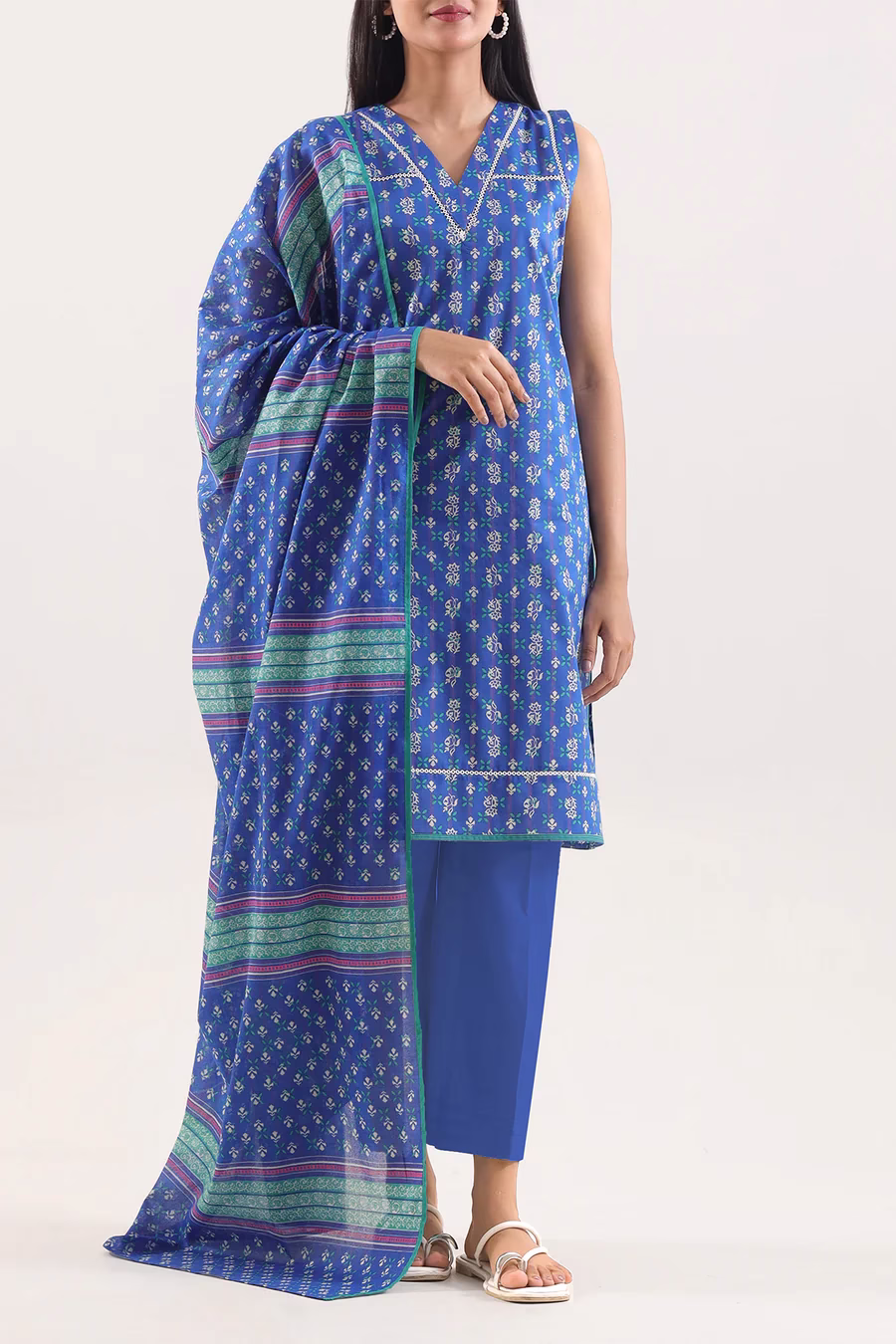 Crafted from premium lawn fabric, the unstitched shirt features a soft texture and a vibrante blue color with an elegant printed design. The printed lawn dupatta adds a touch of flow and femininity, while the dyed cambric trousers complete the look with a clean, breathable finish — ideal for hot weather.