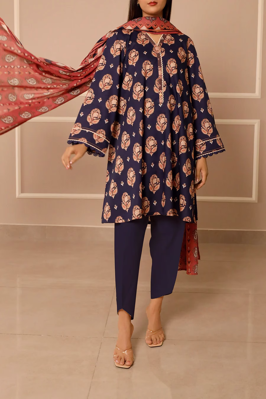 Crafted from premium lawn fabric, the unstitched shirt features a soft texture and a vibrant blue color with an elegant printed design. The printed lawn dupatta adds a touch of flow and femininity, while the dyed cambric trousers complete the look with a clean, breathable finish — ideal for hot weather.