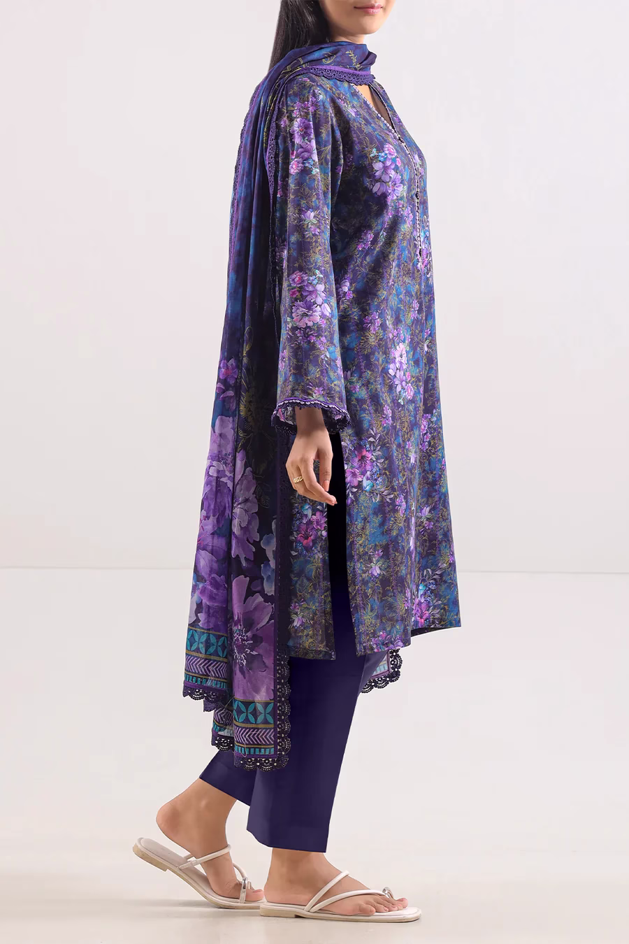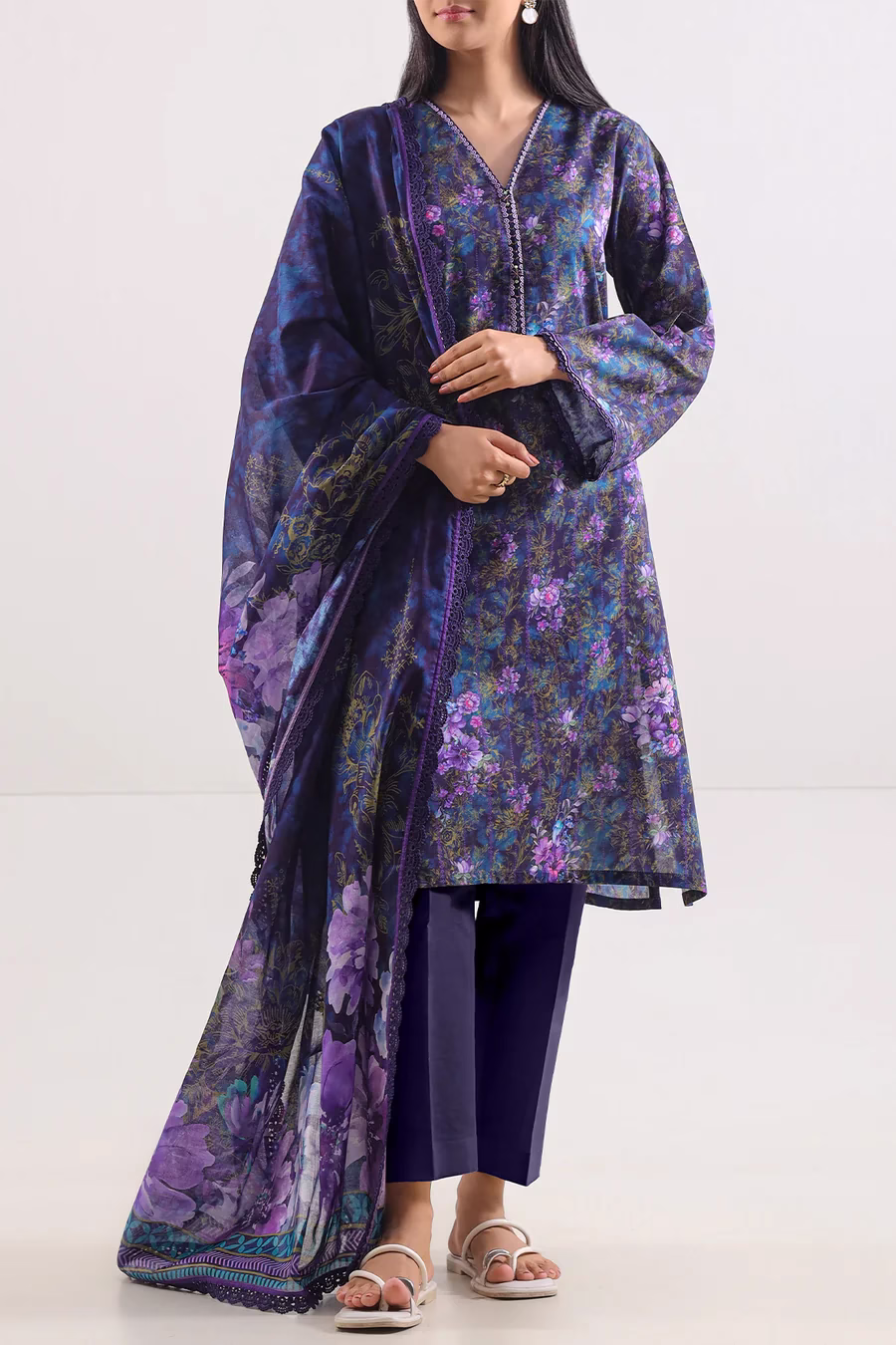 Crafted from premium lawn fabric, the unstitched shirt features a soft texture and a vibrant blue color with an elegant printed design. The premium printed lawn dupatta adds a touch of flow and femininity, while the dyed cambric trousers complete the look with a clean, breathable finish — ideal for hot weather.