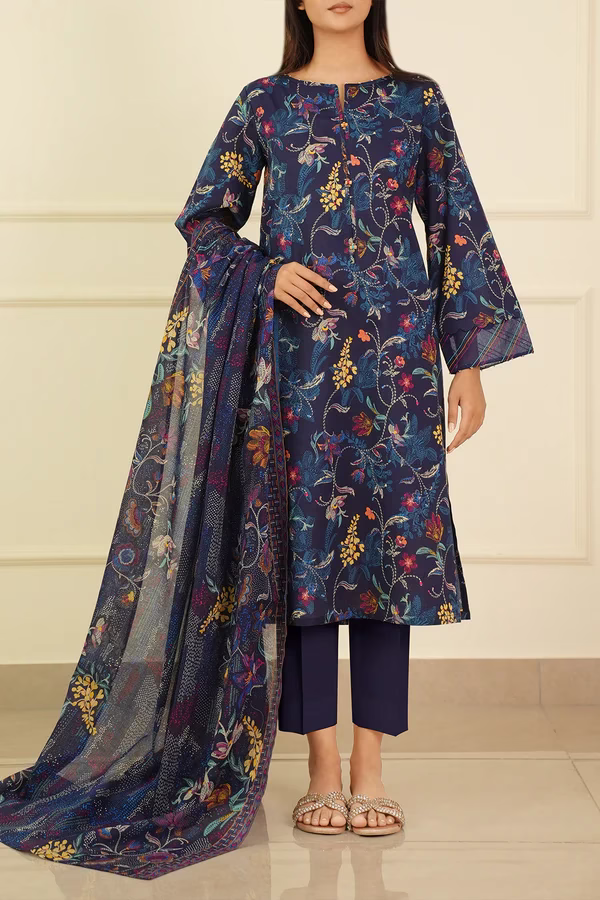 Crafted from premium lawn fabric, the unstitched shirt features a soft texture and a vibrant deep blue color with an elegant printed design. The printed lawn dupatta adds a touch of flow and femininity, while the dyed cambric trousers complete the look with a clean, breathable finish — ideal for hot weather.
