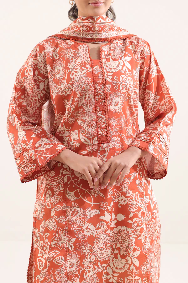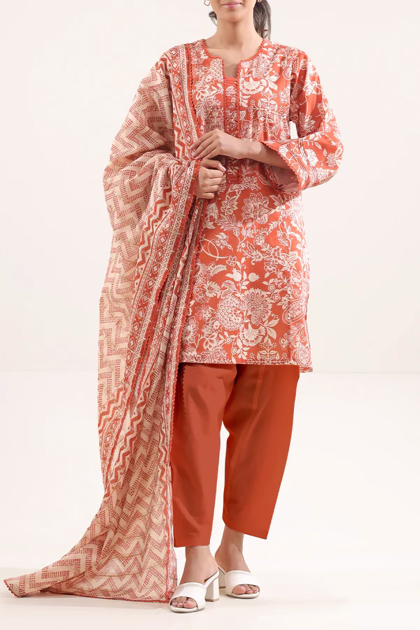 Bring elegance to your everyday look with this unstitched deep rust lawn suit featuring Saya’s original design. Includes a printed lawn shirt, chiffon dupatta, and dyed cambric trousers – available exclusively on Annisafashion.