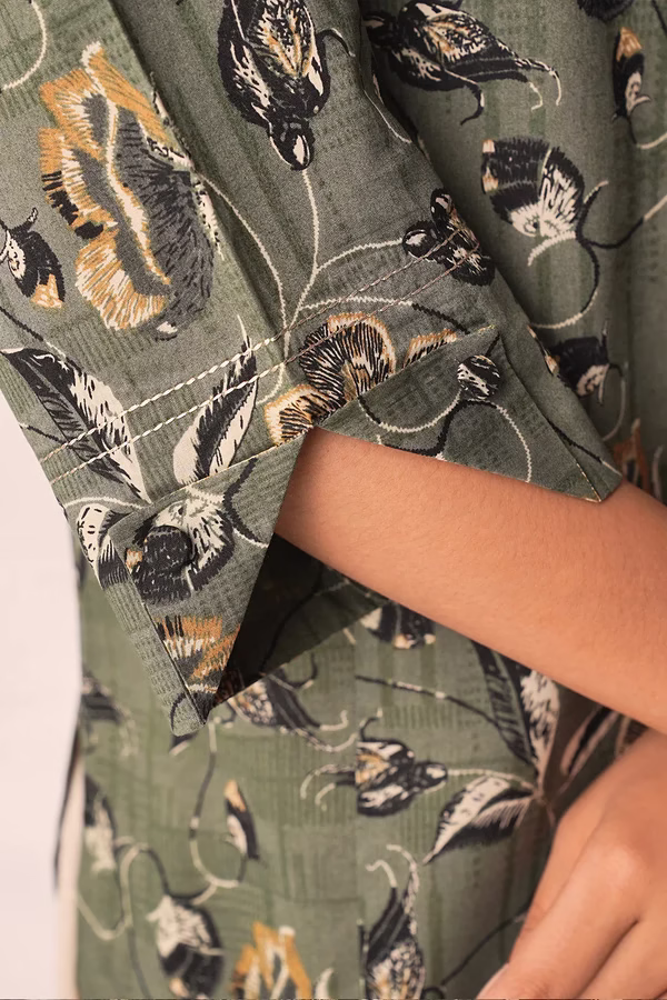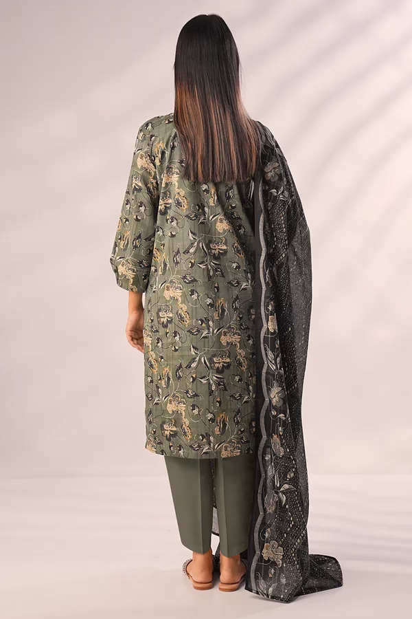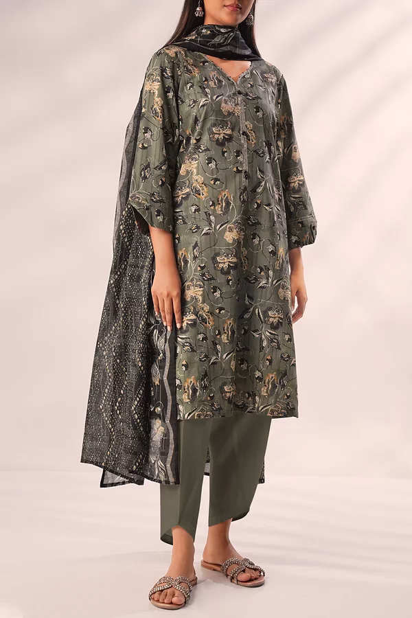 Crafted from premium lawn fabric, the unstitched shirt features a soft texture and a vibrant olive green color with an elegant printed design. The printed lawn dupatta adds a touch of flow and femininity, while the dyed cambric trousers complete the look with a clean, breathable finish — ideal for hot weather.