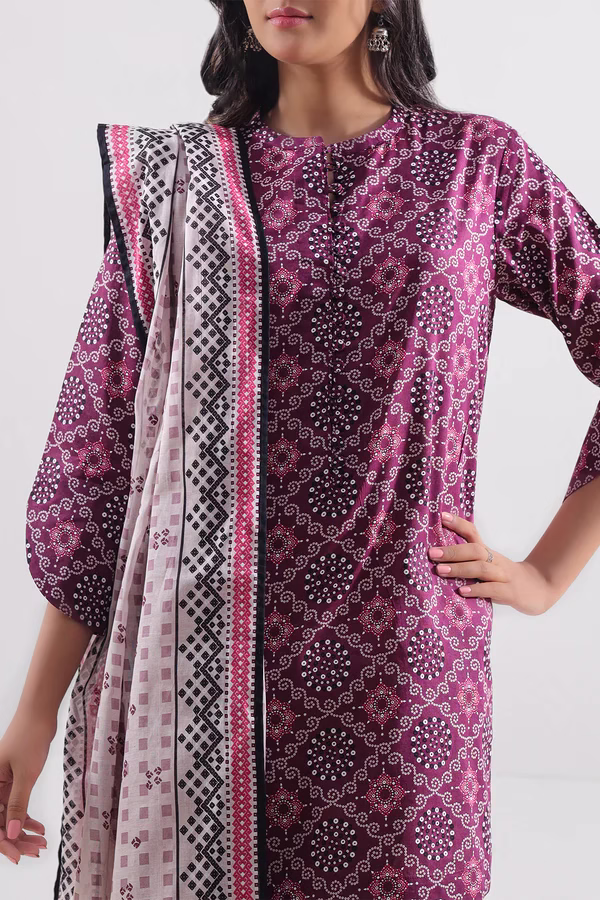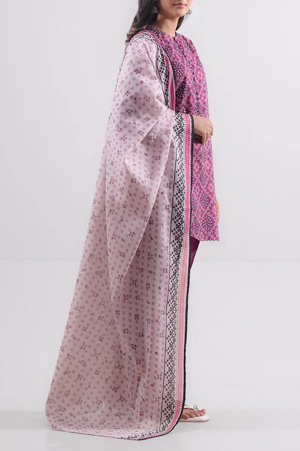 Crafted from premium lawn fabric, the unstitched shirt features a soft texture and a vibrant purple orchid color with an elegant printed design. The printed lawn dupatta adds a touch of flow and femininity complete the look with a clean, breathable finish — ideal for hot weather.